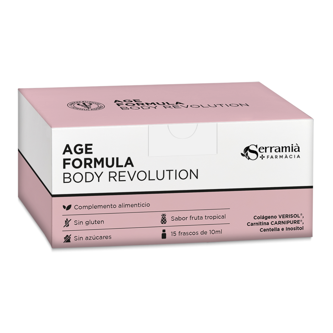Revoluciona tu cuerpo con Age Formula Body Revolution. Este complemento alimenticio contiene Colágeno Verisol®, Inositol, Carnitina Carnipure® y Centella para contrarrestar la laxitud y las imperfecciones de la celulitis. Tome un frasco al día, solo o diluido en agua, y beba abundante agua durante el día para maximizar los efectos. ¡Transforma tu piel durante al menos 3 meses consecutivos!